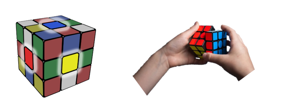 No cubo, por exemplo, o fato de ter de ter como resultado uma face de cada cor costuma nos levar a focar na face externa, unicamente, na superfície isolada. Embora buscar uma face com uma cor esteja de acordo com a definição do resultado desejado para a face, ela não está completa para o cubo. Dê uma olhada na imagem seguinte.